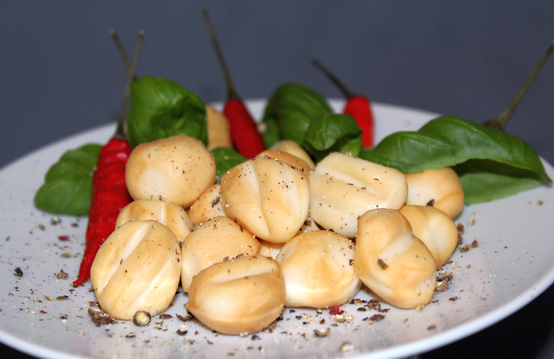 The colour of the cheese is usually white, but smoked versions, known as Scamorza Affumicata, have a brownish tint. Scamorza has a mild and slightly sweet taste, while the smoked variety has a smoky and savoury flavour. Scamorza can be eaten fresh, melted in hot dishes, or grilled. The smoked version adds a distinctive flavour to dishes.